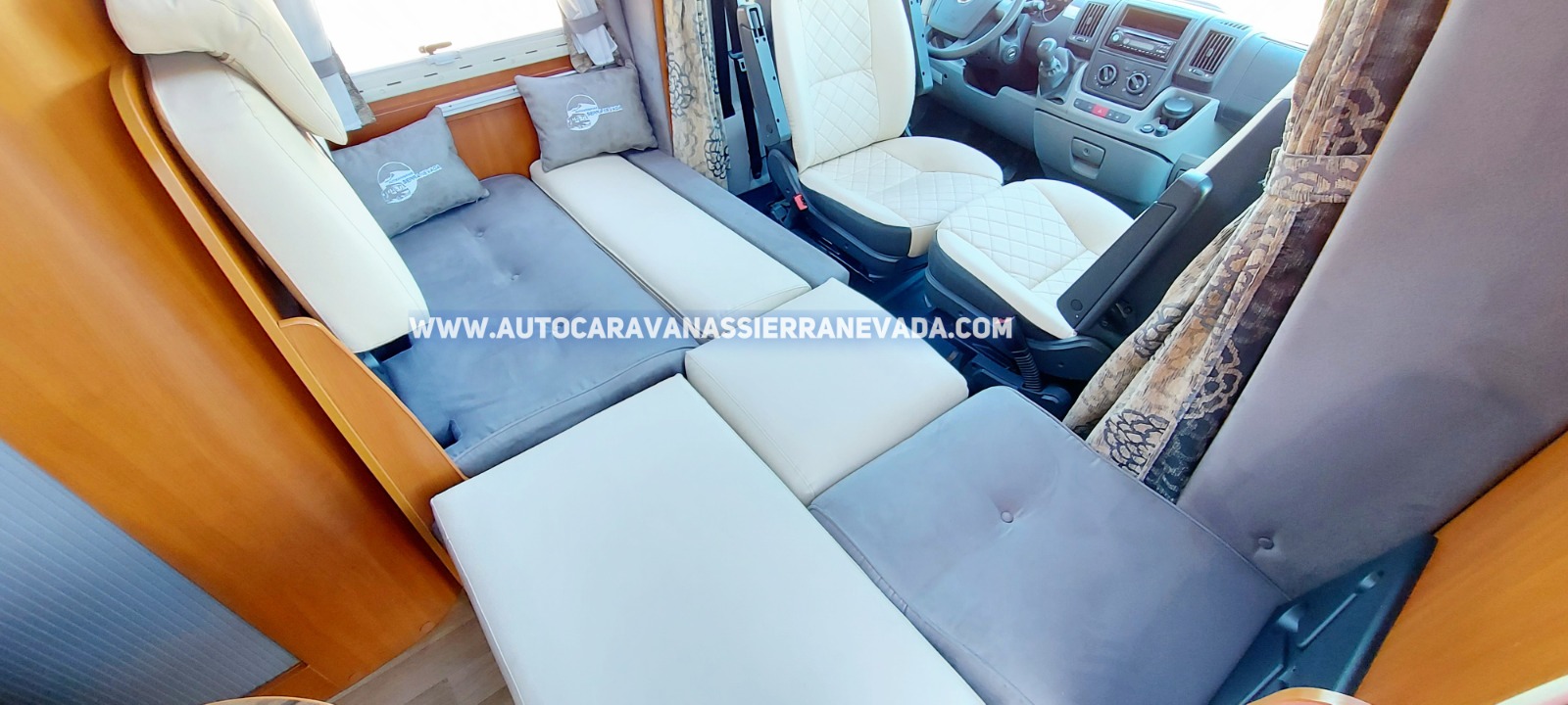 Aire acondicionado(de motor), AirBag (conductor y copiloto), Cierre centralizado(solo delante), Espejos eléctricos, Elevalunas eléctricos (sólo conductor), Radio (CD-MP3), Asientos giratorios, Mosquiteras en ventanas, claraboyas y puerta principal, Claraboya panorámica xxl en cabina y Claraboya xxl en salón, TuboVent en dormitorio, Frigo THETFORD (220v, Gas, 12v) 96L capacidad, Ducha con mampara dentro de aseo, Batería de 100ah., Placa solar de 100w., Boiler Truma para agua caliente y calefacción WEBASTO por gasoil